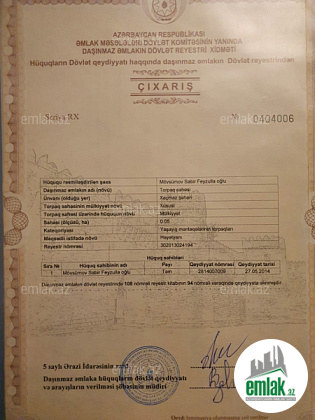 Məmmədoğlu servisin arxası,2005ci il Bələdiyyə sənədi,hər iki tərəfdən məhləhə çıxış var.Qaz,su,işıq,kanalizasiya xəttləri var.Avtobus dayanacağına 5dəqiqəlik məsafə.