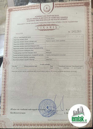 Məmmədoğlu servisin arxası,2005ci il Bələdiyyə sənədi,hər iki tərəfdən məhləhə çıxış var.Qaz,su,işıq,kanalizasiya xəttləri var.Avtobus dayanacağına 5dəqiqəlik məsafə.
