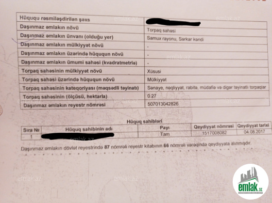 Gəncə şəhərindən 3 km məsafədə Samux r. Sərkar kəndinin tam başlanğıcında obyekt təyinatlı bir çox məqsədlər üçün yararlı 27 sot torpaq sahəsi satılır.Gəncə yolunun üzərində asfalta bitişik yerləşir. 45 metr yola baxır.Bütün kommunal xətlər tam yanındadır.Kənd təsərrüfatı təyinatlı deyil.Bütün növ biznes fəaliyyətləri üçün uyğundur.Sənədi çıxarış