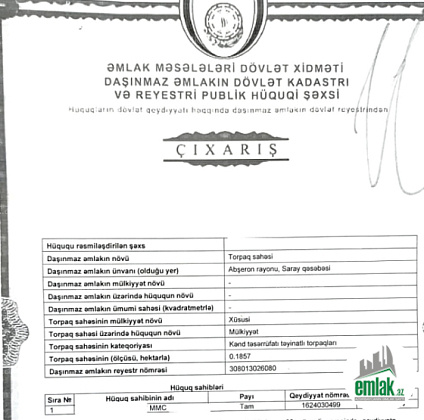 Saray qəs. 18.57 sot torpaq, 7500 AZN/sot. Çıxarış var. Real alıcıların əlaqə saxlamağı xahiş olunur. Torpaq tam satılır (bölgüsüz), endirim olacaq.