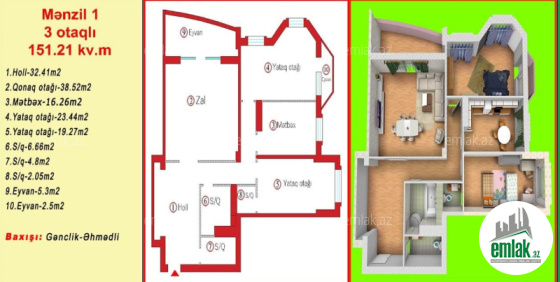 Mənzil yarım yelçəkən olub çox ideal planlamaya sahibdir.