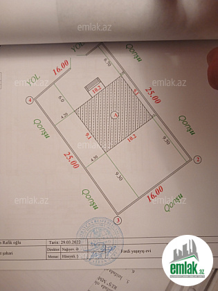 Əsas yola baxan iki qapısı olan, dörd tərəfi hasarla əhatələnmiş geniş həyət. Həyətin daxilində 3 mərtəbəli yarımtikili ev mövcuddur. Bundan əlavə, tam hazır vəziyyətdə olan mühafizə (oxrana) evi də yerləşir....