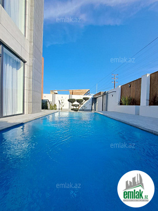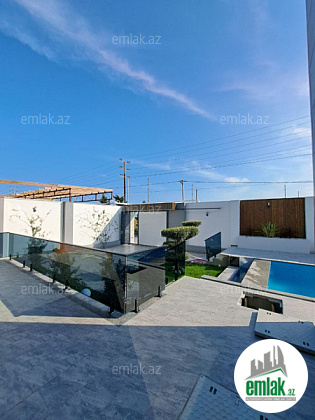 Həyətində filterli hovuzu, maşın saxlamaq üçün sahəsi, yaşıllıq ərazisi və dekorativ ağacları var.