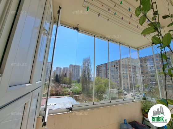 Blok divarı kabançiklə işlənib. Balkonda böyük cam balkon və plastik şkaf yığılıb, əlavə olaraq blokda da sırf mənzilə məxsus 3 metrlik plastik dolab yığılıb.