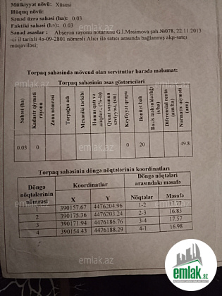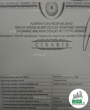 Tam yolun qırağında Hökməli Qobu yolunda Vulkan kafesinin böyründə Aftovağzaldan 567-nömrəli marsritla 12-dəqiqəlik məsafədə yerləşən 3 sot torpaq sahəsi satılır.Torpaq çox gözəl yerdə yerləşir Rəsmdə görəcəksiniz Dənizə görüntüsü var Qaz,İşıq,Telefon, xetti torpaga birləşikdir.Magestral yoldan 30m məsafədə yerləşir. Sənət: Çixarış Xsusi mulkiyyət və