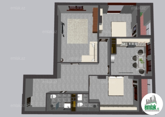 Layihə üzrə 2 yataq otağı, 1 qonaq otağı, 1 mətbəx və 2 sanuzeli var (biri yataq otağında olmaqla).