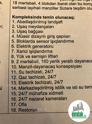 Usaq bagcasi,usaq meydancasi,abadlasdirilmis landsaft,muasir dizaynli giris qapilari,bloklarda sensor isiqlandirma,elektrik generatoru,yeralti dayanacaq,Su qaz elektrik techizati 24/7,ofis,restoran,24/7 muhafize ve nezaret xidmeti,merkezlesdirilmis istilik ve isti su teminati.