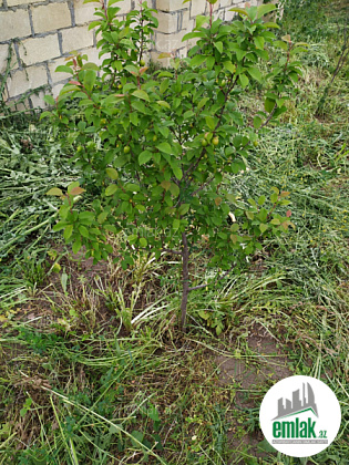 Həyətdə meyvə ağacları və böyük su baseyini var.