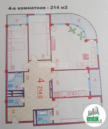 Mənzil: qanuni 4 otaqlı, işıqlı, yarı yelçəkən, təmirsiz, 1 böyük qonaq otağı, 3 yataq otağı, böyük mətbəxi, 2 sanitar qovşağlı, geniş 2 hissəli dəhlizi və 2 böyük balkonlu. Çıxarışda 180 kvm-dir, realda 214 kvm-dir.
