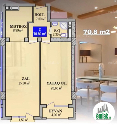Ümumi sahəsi 71 kv olan bu mənzil 2 Otaq-Studiodur.