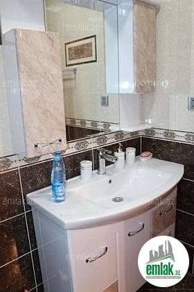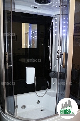 Hamamda radiolu jakuzili ve butun hamam aksesuarlari movcuddur. Divar kagizlari italyan markasidir, yer en keyfiyyeli Polsa laminanti ile dosenib (12mm, parkete beraber).