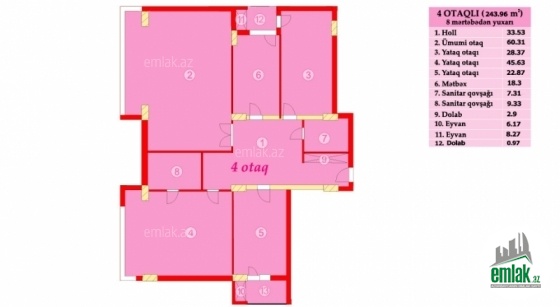 20 mərtəbəli binanın 15-ci mərtəbəsində 244 kvadrat metr sahəli, qonaq otağı, 3 yataq otağı, ayrıca mətbəxi, 2 qarderobu, 2 sanitar qovşağı, 2 eyvanı olan 4 otaqlı təmirsiz mənzil satılır.