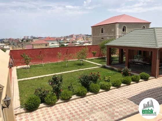 COX TECILI!!! Masazir qəsəbəsi 9 sot torpaq sahəsində tikilmiş 3 mərtəbəli monolit villa satılır. Ümumi sahəsi 680 kv.m., 8 otaq, əla təmir, palıd parket, istilik sistemi kombi, otaqların havalandırma sistami var. 1ci mərtəbədə- mətbəx, yataq otağı, s/q, hovuz, sauna. 2ci mərtəbədə- geniş zal, yataq otağı, mətbəx, s/q. 3-cü mərtəbədə- 3 yataq otağı, 2 s/q (1-i yataq otağında). 2 açıq eyvan. Villa mebel və texnikaları ilə satılır. Həyət tamet ilə döşənib, həyətdə besedka, yay mətbəxi, manqalniy, meyvə və dekorativ ağacları, güllər, 3 maşınlıq qaraj, qarajın altında 30 tonluq su hovuzu. Katelniy, generator xətləri çəkilib. Qazı, suyu, işığı daimidir. Sənədlər qaydasındadır, Torpağın və evin KUPÇASI VAR. Qiymət başlanğıcdır.