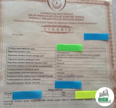 6.5 sot torpaq sahəsi ilə birlikdə ev Rəsulzadə (Kirov) qəsəbəsində Azadlıq prospekti nin sonunda, Azadlıq metrosu, Favorit marketin yaxınlığında yerləşir. Bütün ərazinin və evin özəl mülkiyyət kupçası var. Yerləşdiyi ərazi çox bahalı və yaxşıdır. Villa, obyekt, çoxmərtəbəli bina tikintisi üçün uyğundur. Bütün kommunal xətlər, qaz, su, elektrik daimidir. Evin, ərazinin sökülmə təhlükəsi yoxdur. Ev sökülüb, başqa yerə daşınıb, yenidən quraşdırıla bilər. Üzərində 2ci mərtəbə tikmək də olar. Ev 3 otaqdan ibarətdir, istidir və nəmişlik yoxdur. Yaxınlıqda market, xəstəxana, poliklinika, məktəb, baxar, bütün infrastruktur var. 260.000 dollar, endirim var