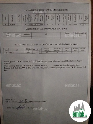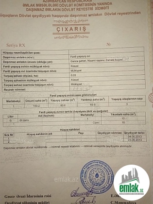 Gence s. 3 nomreli xestexananin yani Zerdabi kuc, Beynelxalq bankin qarsisi asvalt yola 50 metrdir. Kohne tikili 6 sotda yerlesir , butun senedleri qaydasindadi . Qaz , isiq , su kanalzasiya sistemi var (Daimidir).