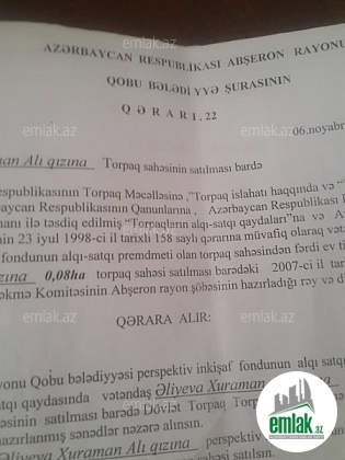 Продаётся земельный участок в Сабунчинском районе, поселок Бакиханова, в местности Араблинка, по проспекту Н. Исмаилова, рядом с дорогой.