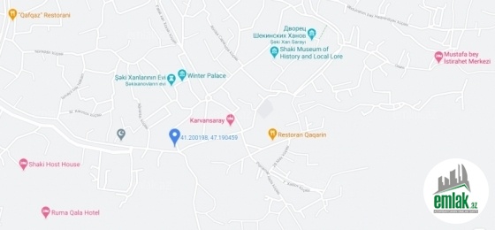 Şəki şəhərində obyekt / müəssisə / ofis / restoran məqsədli ev satılır. M.F.Axundzadə və Cəfər Cabbarlı küçələrinin kəsişməsində yerləşir, qədim Karvan Sarayı və Şəki Xan Sarayının yaxınlığında və ora aparan ana yolun kənarında yerləşir. Ərazinin plana düşdüyü, lakin layihənin reallaşmasına hələ start verilmədiyi bildirilib.