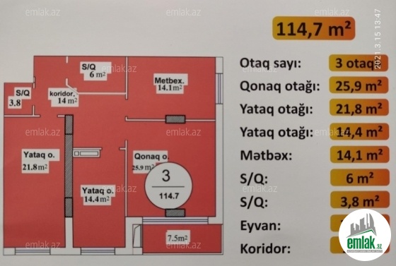 Özüm Satıram. Memar Əcəmi metrosuna 100 metr məsafədə yerləşən Yasham Residence Elit yaşayış kompleksində 114,7 kv 3 otağlı mənzil satılır. Mənzil 2-ci binadadır. Təmirsizdir (Podmayak). Alan şəxsin isdəyindən asılı olaraq mənzili 4 otağda etmək olar. Proektləri şəkildə əlavə etmişəm. Nağd satılır. Təmirə icazə verilib. Yay aylarında Çıxarış almaq olacaq. Binanın tikinti sənədləri tam qaydasındadır. 2 mərtəbəli yeraltı parkinqi və 3 sürətli lifti var. Kompleksdə təhlükəsizlik kameraları, mühafizəçiləri, geniş qapalı həyəti, besetkası, uşaq bağçası, idman meydançası, merketi, fitness spamərkəzi və s. fəaliyət göstərəcək.