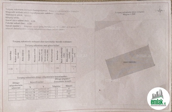 Torpağın yanına kimi qaz, işıq, su çəkilib. 8 sotu 10000 manatdır. Google Mapda kordinatlar (40°23'37.8"N 49°43'52.9"E)