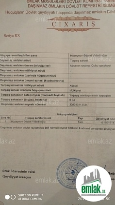 Abşeron rayonu Saray qəsəbəsində. 1) Torpaq sahəsinin kateqoriyası(məqsədli təyinatı) - Yaşayış məntəqələrinin torpaqları. 2) Torpaq sahəsinin mülkiyyət növü- Xüsusi. Daşınmaz əmlakın dövlət reyesterində qeydiyyata al...