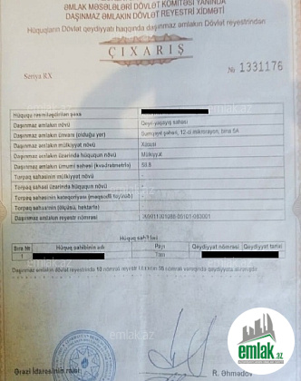 Sumqayıtda 12-ci mikrorayonda 58 kv. metr sahəsi olan yarımzirzəmi satılır. İşiğı, suyu, ayaqylusu var. Çıxarış (kupçası) var. Hal-hazırda 100 manatdan icarədədir. Daha yüksək qiymətə də vermək olar. Ətrafda xeyli yaşayış var, məktəb yolunun üstüdür. Özümündü.