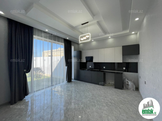 Açıq eyvanı var.Baseyn,manqal,terast cam balkon.Mətbəx mebeli daxil.