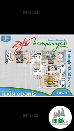 Yeni Zig qesebesinde, yeni 11 mertebeli binanin 11 ci mertebesinde 3 otaqli 114 kv metr ev satilir, tam mertebedir, 2 yapon lifti var, tam 3 otaqdir, skvaznoydur, 2 balkonu var, astonovkanin yanindadir, sahibinden satilir. 25000 ilkin odenis , ayliq 1238 azn 5 il 8 ay qalib, tecili satilir!!!