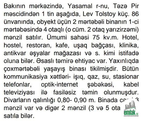 Bakının mərkəzində, Yasamal r-nu, Təzə Pir məscidindən 1 tin aşağıda, Lev Tolstoy küç. 86 ünvanında, obyekt üçün 2 mərtəbəli binanın 1-ci mərtəbəsində 4 otaqlı (o cüm. 2 otaq yarızirzəmi) mənzil satılır. Ümumi sahəsi 75 kv.m. Hotel, hostel, restoran, kafe, uşaq bağçası, klinika, antikvar əşyalar mağazası və s. kimi istifadə oluna bilər. Əsaslı təmirə ehtiyac var. Yaxınlıqda çoxmərtəbəli yaşayış binası tikilmişdir. Bütün kommunikasiya xəttləri- işıq, qaz, su, stasionar telefonlar, optik-internet şəbəkəsi, kabel televiziyası ilə fasiləsiz təmin olunmuşdur. Divarların qalınlığı 0,80- 0,90 m. Binada cəmi 3 mənzil var və digər 2 mənzil (3 və 5 otaqlı) də satıla bilər.