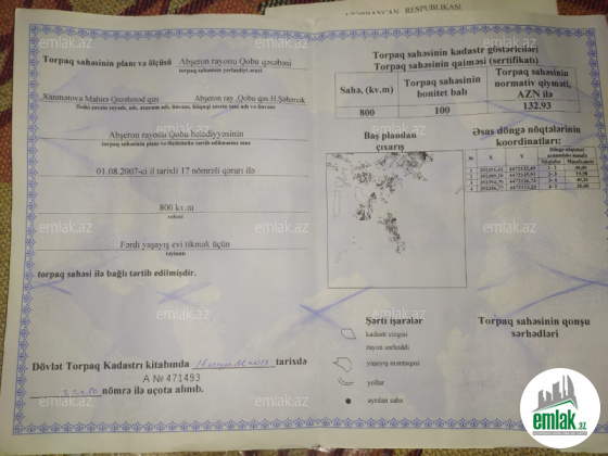 Qobu qəsəbəsində Təcili torpaq satılır. Sənədləri var xəritəsi çəkilib, sənədləri kupça almaq üçün hazırdır. Ətrafında yaşayış var. Bütün komunallar (qaz, işiq, su) xətləti tam yanında var.