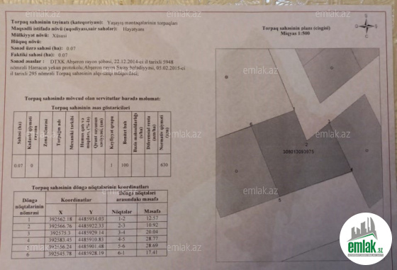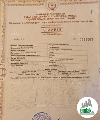SAHİBİNDƏN-Abşeron rayonu Saray qəsəbəsi təzə magestral yoldan 500 metr məsafədə yerləşən 7 sot torpaq satılır. Torpaq hündür yerdədir, Badam bağlarına və Masazıra tərəf panarama var. Yaşayış olan yerdədir. Sənəd kupça (çıxarış) Qiymət torpağın ümumi sahəsinə aiddir. Real alıcı ilə qiymətdə razılaşmaq olar.