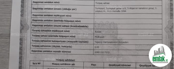 Sumqayıtda yaşıl dərənin yuxarı hissəsində 39 nömrəli marşrutun son dayanacağından sol tərəfdə 3 sot hasarli çıxarışı olan kommunal xətlərin olduğu torpaq sahəsi satılır. Real alıcıya endirim ediləcək.