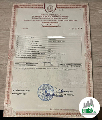 Sovxoz-Pirşağı yolundan 300 metr aralıda fərdi yaşayış təyinatlı torpaq sahəsi satılır. Torpağa gedən yol asfaltdır və işıq, su, kanalizasiya, qaz, telefon xətləri torpağa bitişik ərazidən keçir. Torpağa 5 daşdan ibarət bünövrəsinə beton verilməklə hasar çəkilmişdir. Torpaq iki yerə bölünməklədə satıla bilər