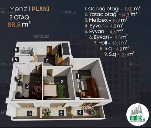 Sumqayıt şəhəri bulvar ərazisində Hüquq MTK-da yeni tikili 11 mərtəbəli evin 6-cı mərtəbəsində ümumi sahəsi 88.8 m/kv olan 2 otaq (1 salon,1 yataq otağı,1 mətbəx, hamam tualet ayrıdı, geniş dəhlizli, 3 balkonlu), təmirsiz, çıxarışlı (kupçalı) mənzil satılır. Şəhərə,dənizə və bulvara gözəl mənzərəsi, otaqlar və mətbəxin hər birinin qarşısında balkonu var, işıqlı mənzildi. Mənzilin sayğacları quraşdırılıb. Qaz, su, işıq daimidir. 2 lifti var.