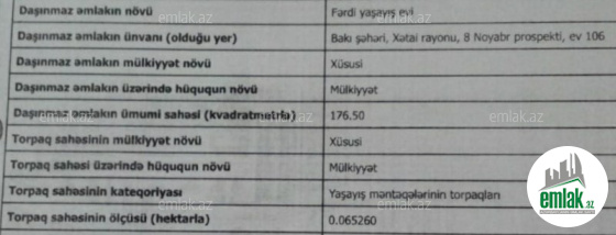 Əsas yola baxan iki qapısı olan, dörd tərəfi hasarla əhatələnmiş geniş həyət. Həyətin daxilində 3 mərtəbəli yarımtikili ev mövcuddur. Bundan əlavə, tam hazır vəziyyətdə olan mühafizə (oxrana) evi də yerləşir....