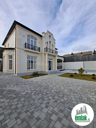 Həyətində filterli hovuzu, evin önündə verandası, dekorativ ağacları və maşın saxlamaq üçün yer var.
