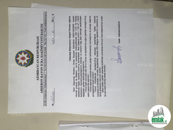 Torpağın 3sotu üçün fərdi yaşayış sərəncamı çıxarışı var və bütün sənədləri qaydasındadır. 2əd fərqli layihələrdə 1mərtəbəli və 2mərtəbəli ev üçün layihə çəkilib və icra hakimiyyəti tərəfindən təsdiqlənərək tikinti icazəsi alınıb. 2mərtəbəli evin bünövrəsi tökülüb.