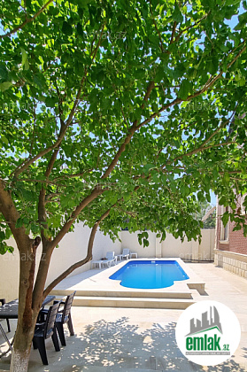 Salam. Bag Pirsagida Qizilqumda denizden 500 metr aralida yerlesir. Balkondan deniz gorsenir. Her bir seraiti var. Basseyn filterli,bilyard,manqal,samovar,sac,internet,kondisioner,paltar yuyan,qab yuyan,mikrodalgali soba,3 dene soyuducu,dispensor,kombi,3 dene smart tv ve sairə. 3 yataq otagi, 1 genis zal,mansart,metbex her iki mertebede h/t heyetde h/t var. Oz bagimdir!
