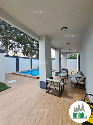 Həyətində filterli hovuzu, istirahət zonası, manqalı, geniş yaşıllıq ərazisi və dekorativ ağacları mövcuddur.