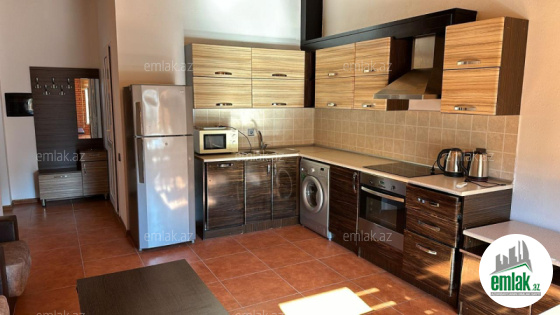 Geniş işiqli qonaq otaqi, ayrica quraşdirilmiş məbəxi və yataq o...