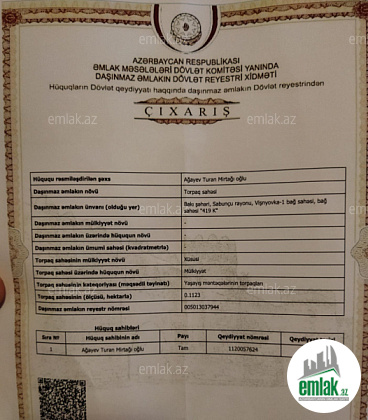 Şüvelanda cox prestijli bir yerde, Şuvelan-deniz yolunda, \"Şuvelan Park\"dan sola ,Deniz yoluna düşende sag terefde, merkezi magistral yoldan texminen 250-300 m icerde, 4 terefi yaşayış ve bag evleri olan mehellede,12 ...