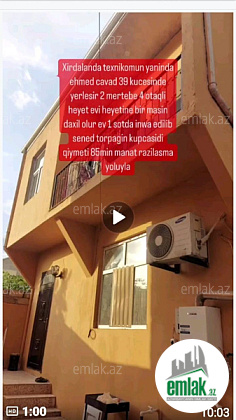 xırdalanda yasmin parkin yaninda 1.5 sotun icerisinde 4 das kürsülü 2 mərtəbe 4 otaq kuxna h/t temirli qaz su işiq daimdiir sənət kupca 2 masinlıq həyeti var qiymət 80000 azn