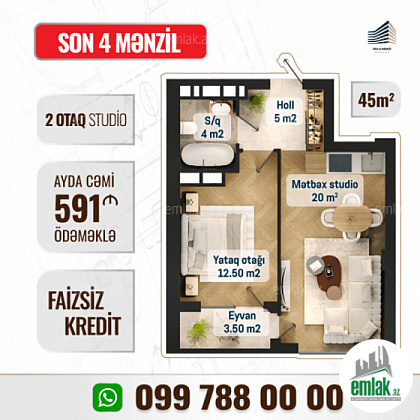2 otaqlı studio - 45 kv/m sahəli mənzil