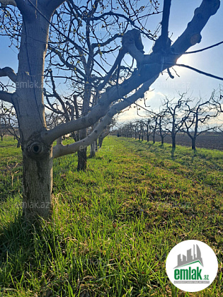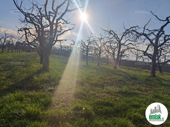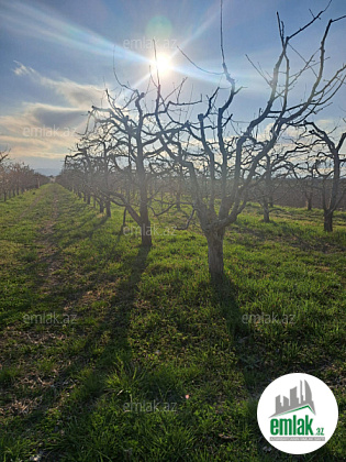 Torpaq sahəsində alma bağı var. Ağ palmet