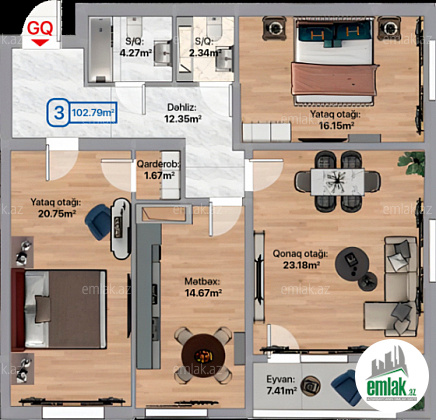 Ümumi sahə: 82 kv.m