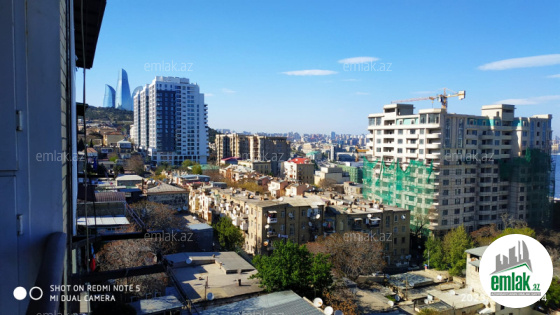 Balkonundan şəhərə — o cümlədən Alov Qüllələrinə gözəl mənzərə açılır.