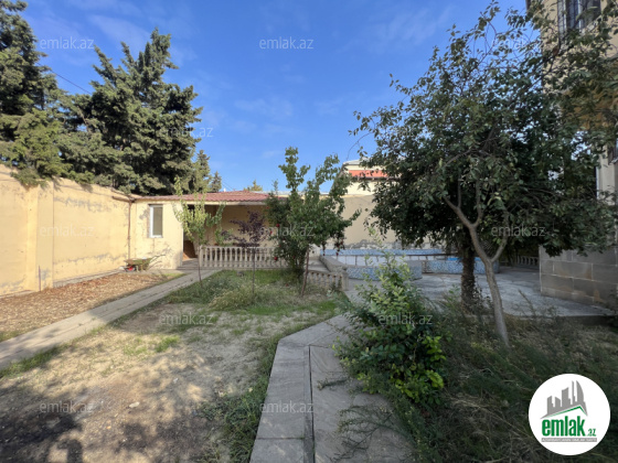 Həyətdə meyvə və dekorotiv ağacları,açıq hovuz.