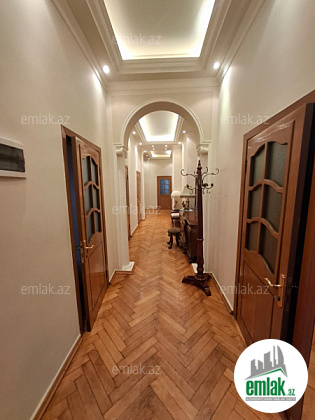 Klassik üslubda təmir, döşəmə parket, tavan hündürlüyü 3.5 metr.