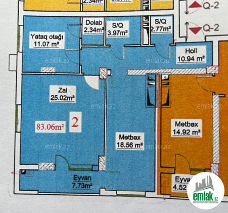 -Ümumi sahəsi 83m² olan 2 otaqlı mənzildir.