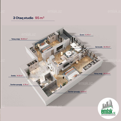 2 otaqdan 3 otağa düzəlmə (studiya plan)