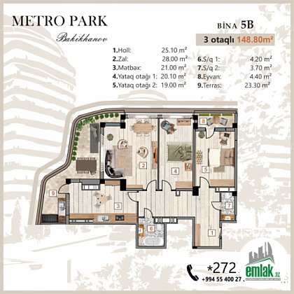 “Metro Park Bakikhanov” 4.6 hektarda, ümumilikdə 5 bina, 12 blok, 1288 mənzildən ibarət, bir yaşayış kompleksidir. Kompleksdə hər sinfə uyğun mənzil seçimləri mövcuddur. Belə ki, hündürlüyü 3.2 m, vitraj pəncərələr, səssiz işləyən liftlər, 1,2,3 və 4 otaqlı olmaqla, 36 m2 –dən 200 m2 -ə qədər, sərbəst planlana bilən mənzilləri həm təmirli, həm də təmirsiz olmaqla, 1 m2 1900 Azn-dən başlayan qiymətlərlə, nağd və sərfəli daxili faizsiz, uzun müddətli İpoteka ilə, əldə etmək imkanı mövcuddur. Kompleksdə uşaqlar üçün oyun meydançaları, yaşıllıq və istirahət zonaları, velosiped zolaqları, sakinlər üçün nəzərdə tutulub. 2 mərtəbəli yeraltı qarajlar, qonaqlar üçün, yerüstü avto dayanacaqlar, marketlər, kafe, restoranlar və ən əsası kompleksin həyətində giriş və çıxışları nəzərdə tutulan və vaxtınıza qənaət edəcək bənövşəyi zolaqlı “BAKIXANOV” metro stansiyasının olmasıdır